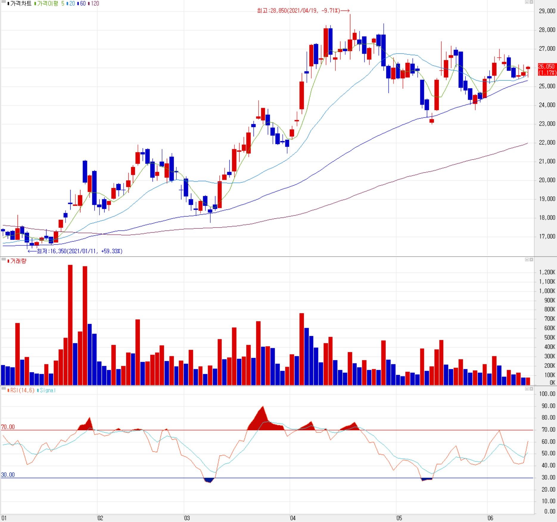 2021년 들어서도 당사의 주가는 이른바 '콜드체인 관련주' 및 반도체 슈퍼사이클에 대한 수혜주로서 주목받으면서 여러 차례 신고가를 갱신하는 등 상승세를 보이다가 5월까지는 시장 변동성에 따른 조정을 받은 후 최근에는 26,000원 부근에서 주가가 형성되고 있습니다. 최근 한 달간 수급에서는 개인의 매수 우위에 기관과 외국인은 매도로 대응하는 형국입니다. 예상 실적과 차트 소견을 종합한 개인적인 목표주가는 지난 분석과 같은 30,000원을 유지합니다.