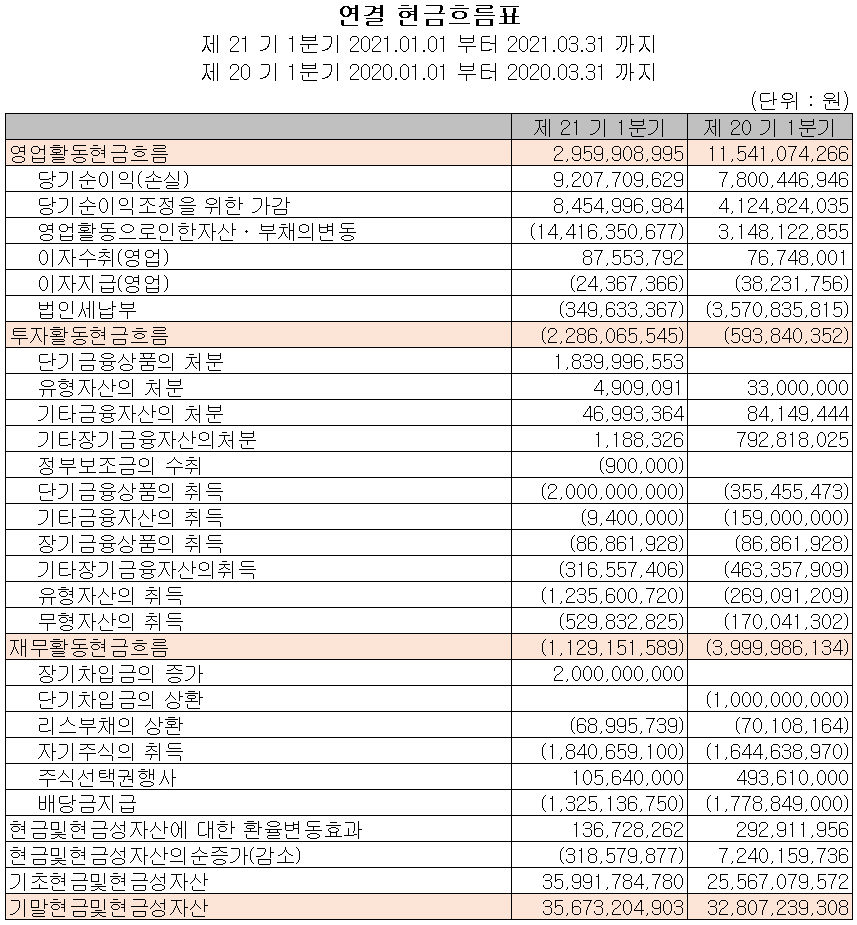 지난 1분기 영업활동 현금흐름에서는 총 30억 원의 현금이 유입되었으며, 재무활동 현금흐름에서는 차입금을 조달하여 부채를 상환했고, 배당금을 지급하였습니다. 투자활동에서는 유무형 자산을 취득하고 금융상품을 취득하면서 23억 원의 현금이 유출되었습니다.