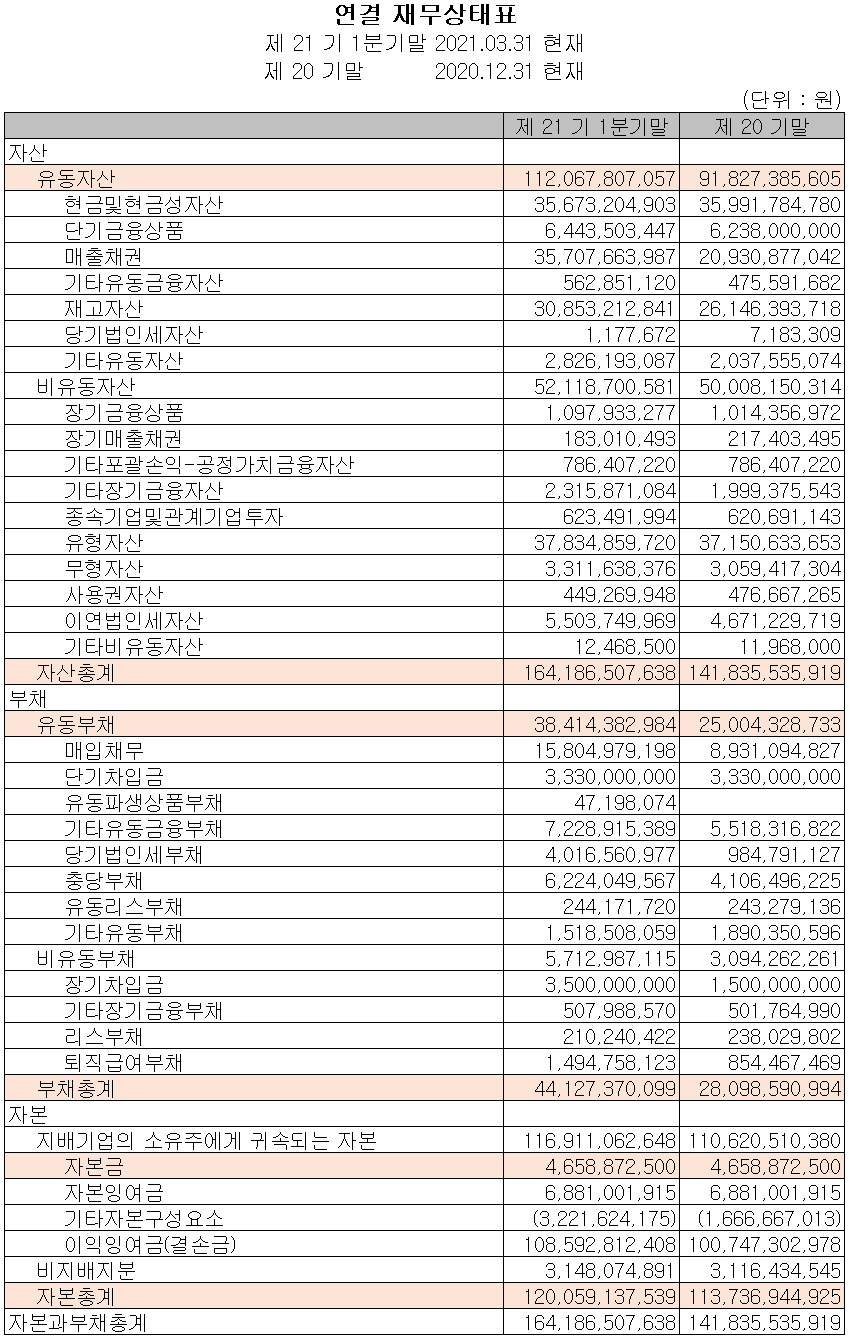 당사의 지난 1분기 말 기준 자산 총계는 전기보다 15.8%(224억 원) 증가한 1,642억 원으로 매출채권 및 재고자산 등의 증가에 기인합니다. 부채 총계는 57%(160억 원) 증가한 441억 원으로 매입채무, 충당부채 및 기타유동금융부채 등의 증가에 따른 것입니다.