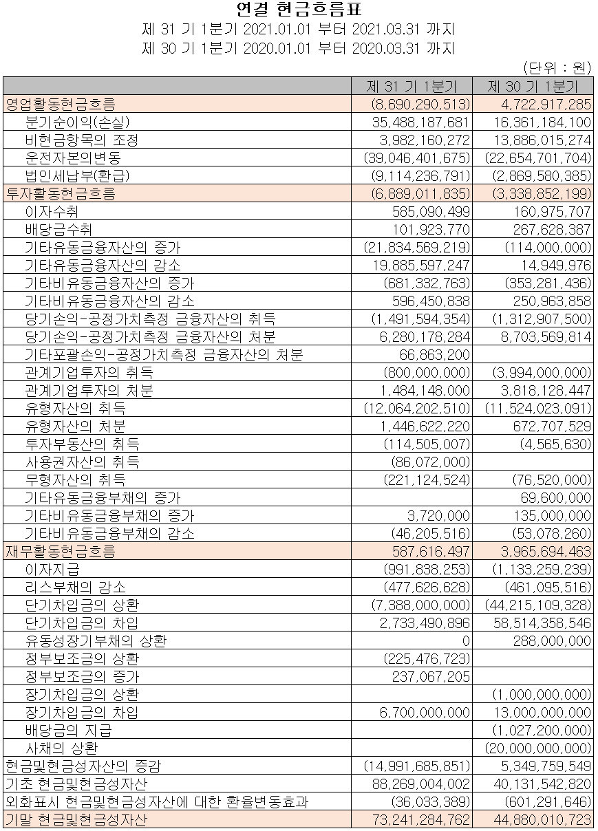 지난 1분 영업활동 현금흐름에서는 매출채권 및 계약부채의 변동에 따라 총 87억 원의 현금이 유출되었습니다. 재무활동에서는 차입금을 조달하여 부채를 상환하고 이자를 지급했으며, 유무형 자산을 취득하였습니다. 2021년 1분기 말 기준 현금 및 현금성 자산은 전년 동기보다 284억 원이 늘어난 732억 원을 보유하고 있습니다.
