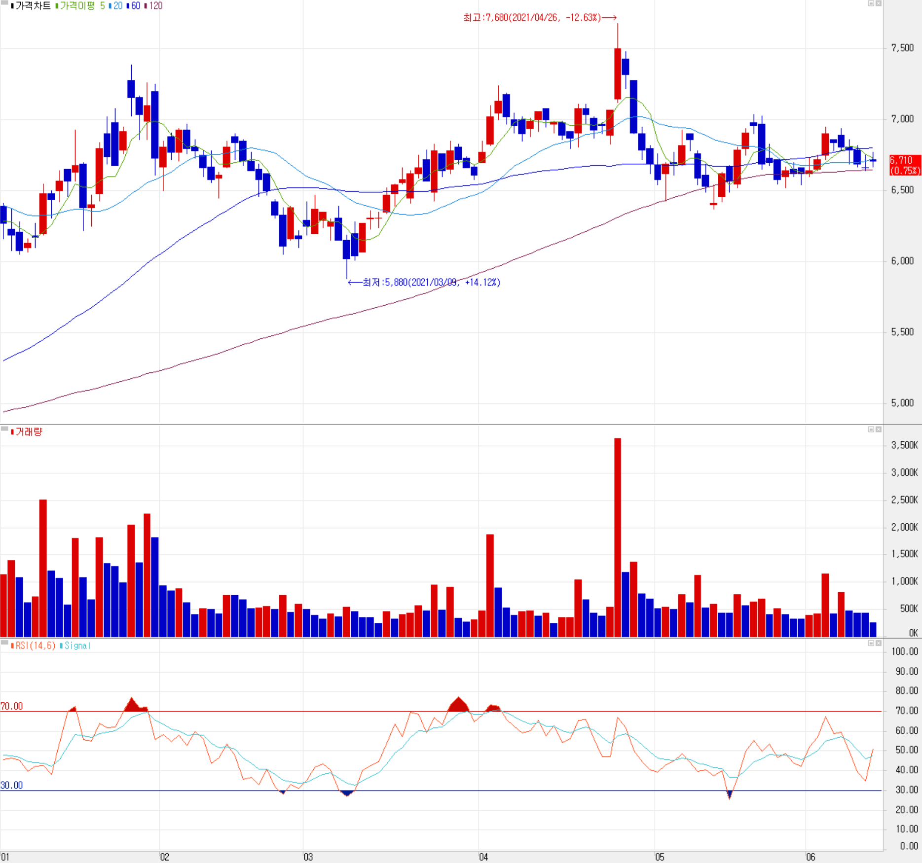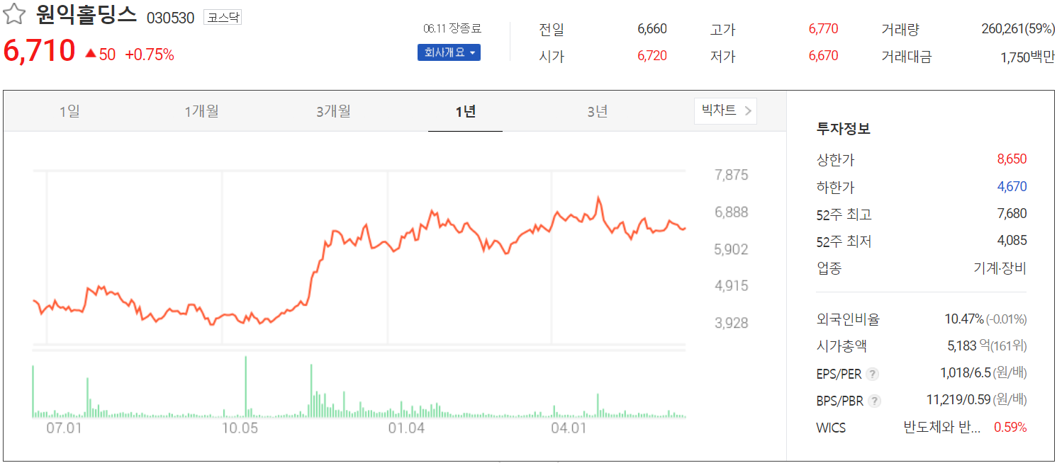 6월 11일 장 종료 기준 당사의 주가는 전 거래일보다 0.75% 오른 6,710원에 거래를 마쳤습니다. 외국인 비중은 10.47%이며, 시가총액 5,183억 원으로 코스닥 시총 161위 종목입니다.
