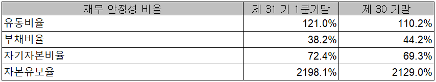 2021년 1분기 말 기준 당사의 재무 안정성 비율에서는 유동비율 121%, 부채비율 38.2%, 자기자본비율 72.4%, 자본유보율 2,198.1%를 기록하면서 양호한 재무상태를 유지하고 있습니다.