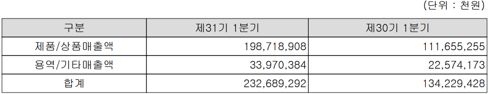 지난 1분기 실적에서 내수가 차지하는 부분은 매출액 1,293억 원으로 전체 매출액의 55.6%, 해외 부문 매출은 1,034억 원으로 44.4%를 매출 비중을 기록했습니다.
