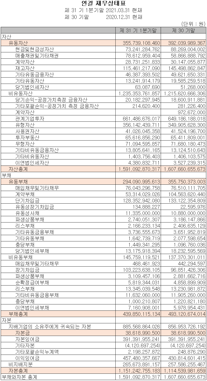 당사의 지난 1분기 말 기준 자산 총계는 전기 대비 1% 감소했으며, 부채는 10.8%(533억 원) 감소했습니다. 계약부채 및 유동성 사채, 차입금, 당기 법인세 등의 감소에 따라 부채비율이 줄었습니다.