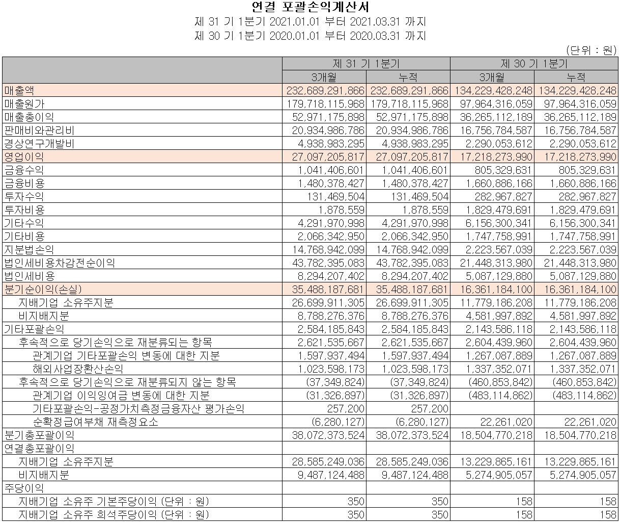 지난 1분기 당사의 실적은 매출액 2,327억 원으로 전년 동기 대비 73.4% 증가했고, 영업이익은 271억 원으로 57.4% 증가, 당기순이익은 355억 원으로 116.9% 증가했습니다.