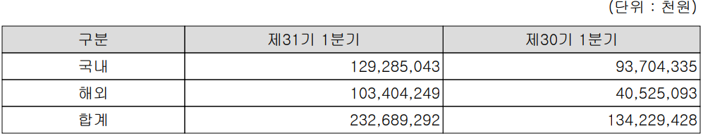 지난 1분기 실적에서 내수가 차지하는 부분은 매출액 1,293억 원으로 전체 매출액의 55.6%, 해외 부문 매출은 1,034억 원으로 44.4%를 매출 비중을 기록했습니다.