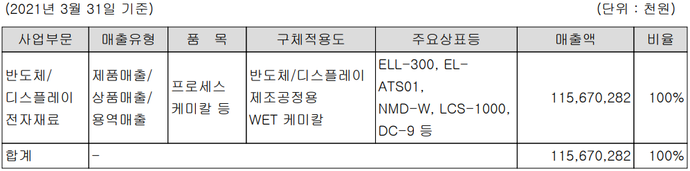 당사는 반도체 및 디스플레이 제조 공정에 적용되는 케미칼을 제조, 공급하는 단일 사업부문으로 구성되어 있으며, 주요 제품에는 신너, 현상액, 식각액, 발리액 등 프로세스 케미칼과 반도체 포토레지스트용 원료 등의 화인 케미칼 그리고 디스플레이용 컬러페이스트 등이 있습니다.