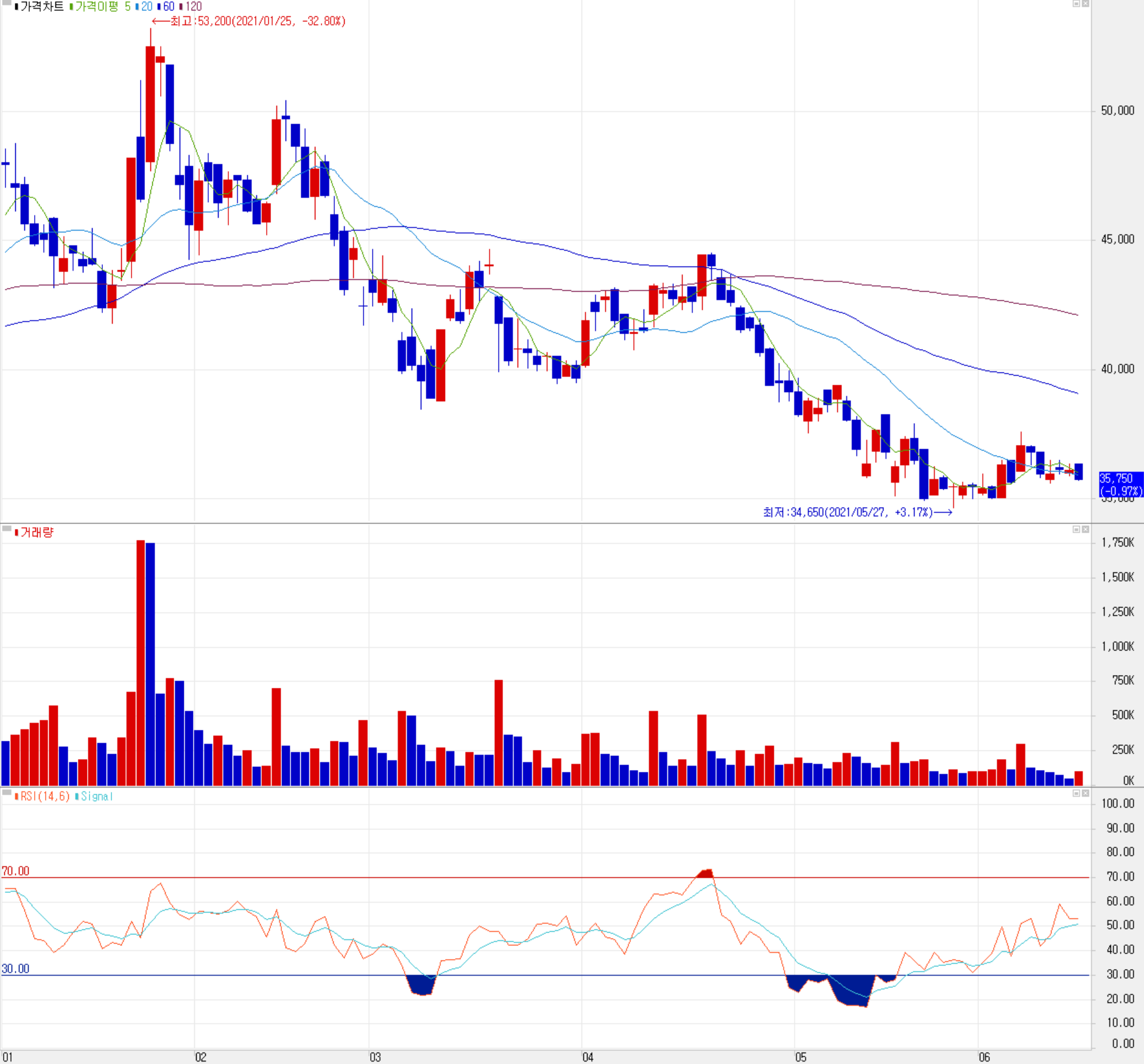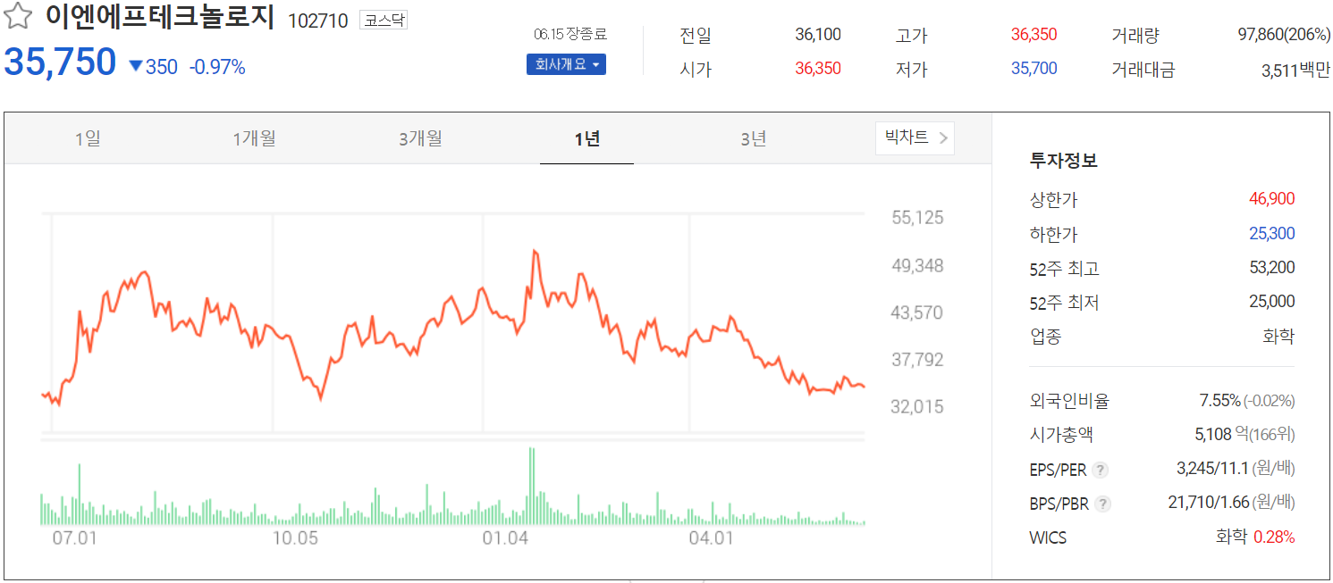 6월 15일 장 종료 기준 당사의 주가는 전 거래일보다 0.97% 내린 35,750원에 거래를 마쳤습니다. 외국인 비중은 7.55%이며, 시가 총액 5,108억 원으로 코스닥 시총 166위 종목입니다.
