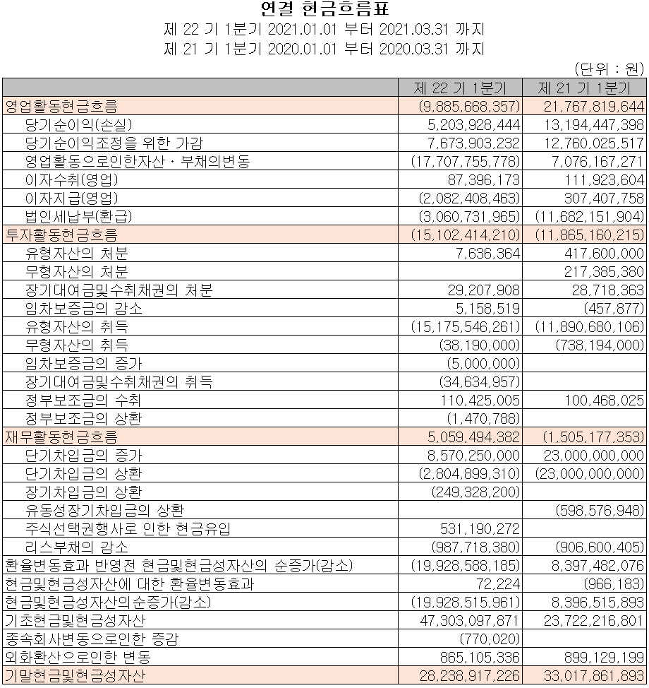 지난 1분기 영업활동 현금흐름에서는 총 99억 원의 현금이 유출되었으며, 차입금을 조달하여 부채를 상환하고 유무형 자산을 취득하였습니다. 2021년 1분기 말 기준 현금 및 현금성 자산은 전년 동기 대비 48억 원 감소한 282억 원을 보유하고 있습니다.