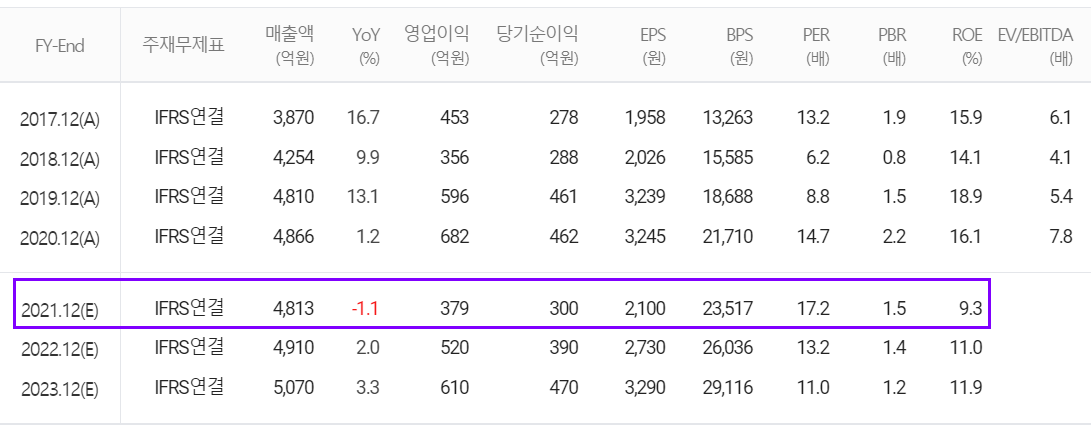 당사의 2021년 연간 예상 실적에서는 매출액 4,813억 원으로 전년 대비 1.1% 감소하고, 영업이익은 379억 원으로 44.4% 감소할 것으로 추정했습니다. 전반기 실적 감소 요인이 점차 개선되며, 2020년 초 착공한 미국 오스틴 공장 가동이 2022년 시작되면서 시스템 반도체 향 점진적인 매출 증대가 예상됩니다.