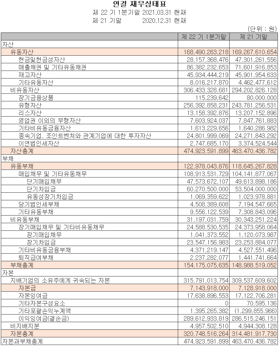 당사의 지난 1분기 말 기준 자산 총계는 전기보다 2.5%(115억 원) 증가한 4,749억 원으로 매출 채권 및 유형 자산의 증가에 기인합니다. 부채 총계는 전기보다 3.5%(52억 원) 증가한 1,542억 원으로 매입채무 및 차입금의 증가가 있었습니다.