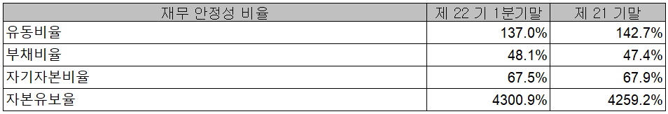 2021년 1분기 말 기준 당사의 재무 안정성 비율에서는 유동비율 137%, 부채비율 48.1%, 자기 자본비율 67.5%, 자본 유보율 4300.9%를 기록하면서 안정적인 재무상태를 유지하고 있습니다.