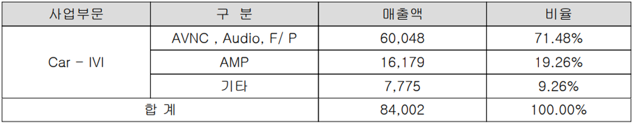 당사는 차량용 전장 부품인 Car Audio와 AMP, Monitor 및 AVNC 등 차량용 인포테인먼트 제품을 개발, 공급하고 있습니다. 지난 1분기 AVNC, Audio 등의 매출은 600억 원으로 전체 매출의 71.48%를 차지했고, AMP는 162억 원으로 19.26%의 매출 비중을 기록했습니다.