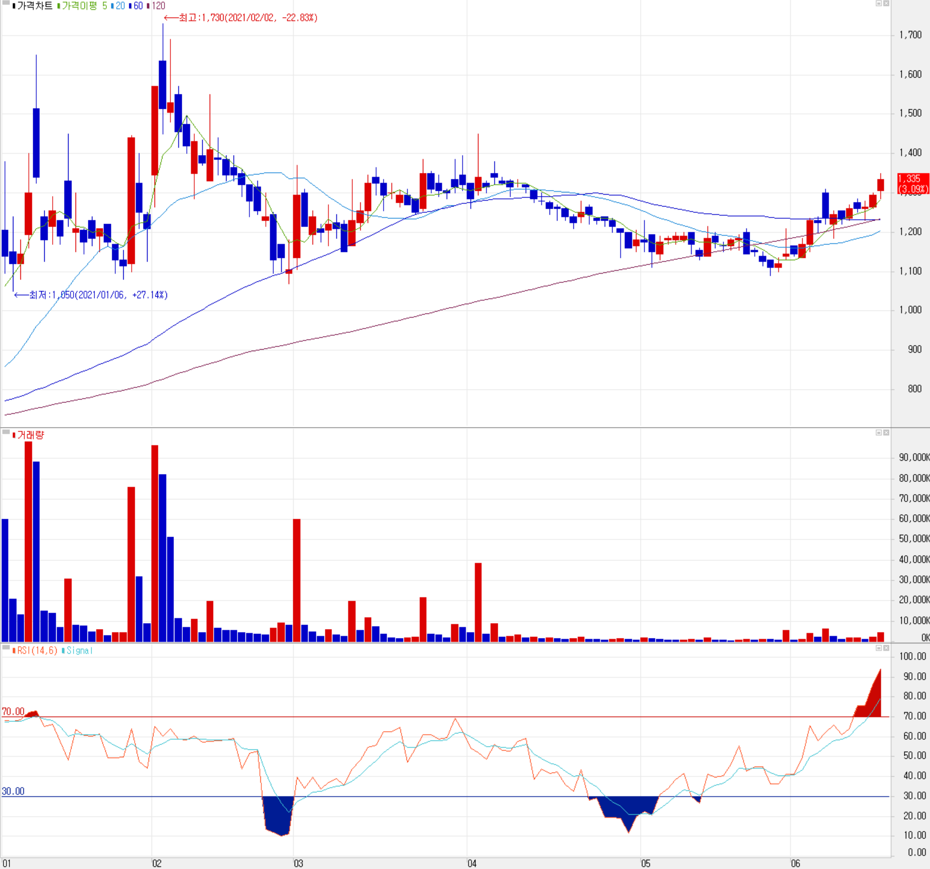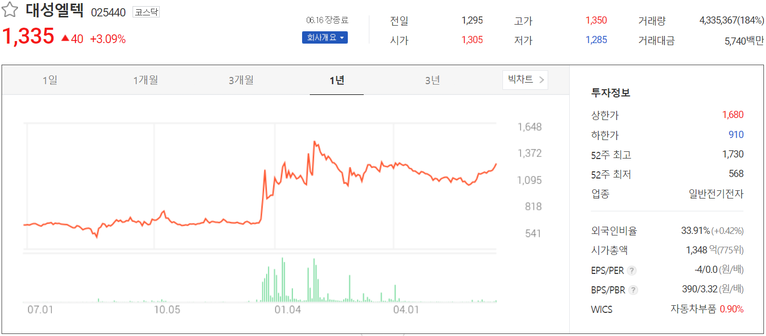 6월 16일 장 종료 기준 당사의 주가는 전일보다 3.09% 오른 1,335원에 거래를 마쳤습니다. 외국인 비중은 33.91%이며, 시가 총액 1,348억 원으로 코스닥 시총 775위 종목입니다.