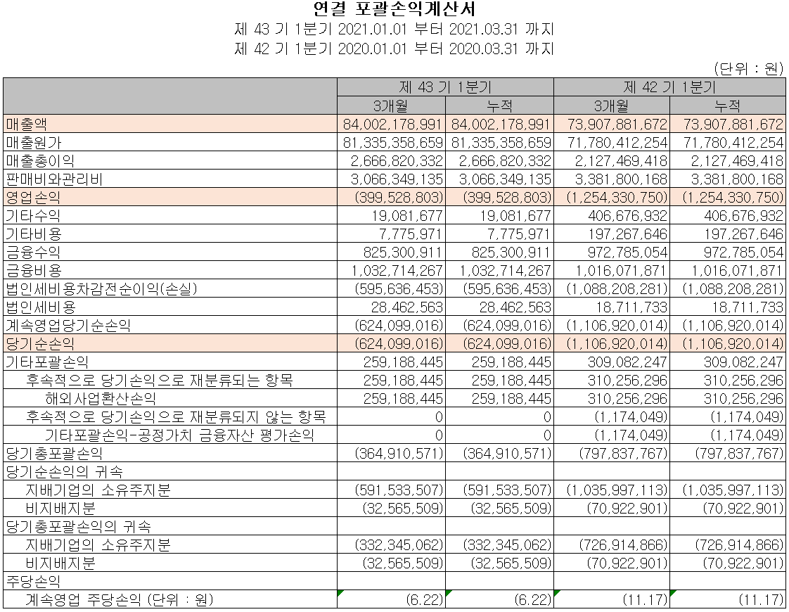 당사의 지난 1분기 실적은 매출액 840억 원으로 전년 동기 대비 13.7% 증가했고, 영업손실 4억 원, 당기순손실 6억 원으로 적자 지속입니다. 자율주행 핵심 기술 연구 개발 비용, 원자재 가격 상승 등으로 매출 원가 및 고정비 부담이 지속되는 상황입니다.