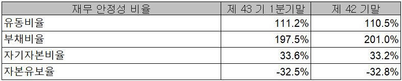2021년 1분기 말 기준 당사의 재무 안정성 비율에서는 유동비율 111.2%, 부채비율 197.5%, 자기 자본비율 33.6%, 자본 유보율 -32.5%을 기록했습니다. 전반적으로는 당사의 자율주행 핵심기술에 대한 연구개발 비용의 증가, 원자재 가격 상승 및 판가 인하 등으로 실적 부진을 보이면서 전반적인 재무상태도 좋지 않습니다.
