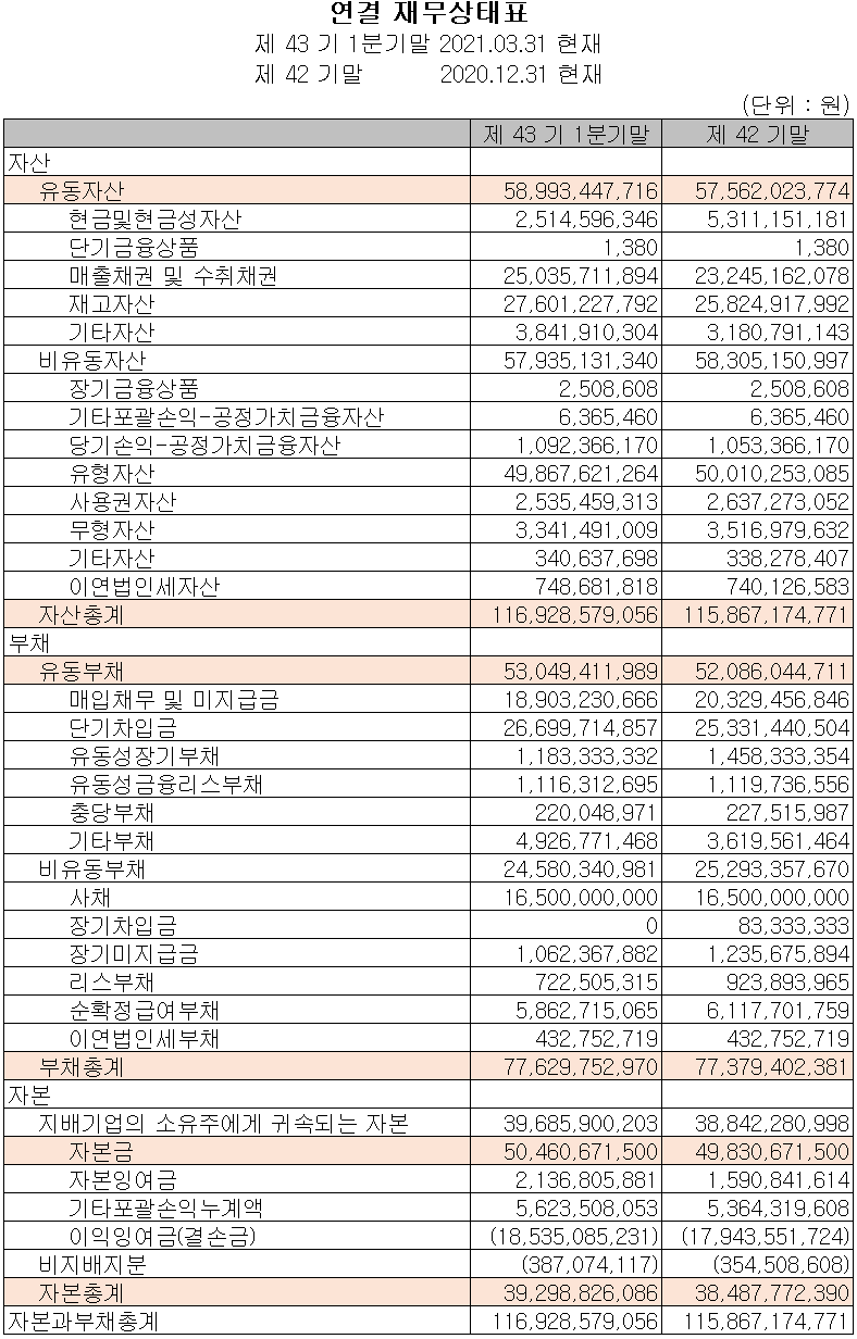 당사의 지난 1분기 말 기준 자산 총계는 전기보다 0.9% 증가한 1,169억 원이며, 부채 총계는 0.3% 증가한 776억 원으로 당기 중 큰 변동은 없었습니다.