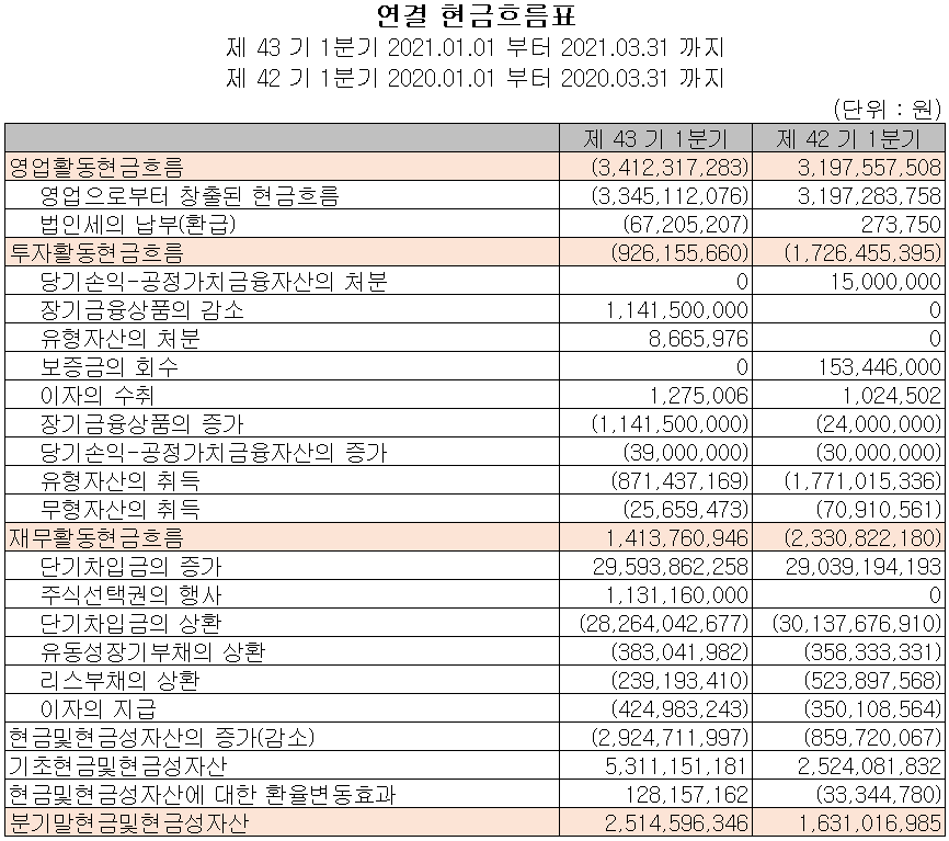 지난 1분기 영업활동 현금흐름에서는 34억 원의 현금이 유출되었으며, 차입금 조달 및 주식 선택권 행사 등으로 자금을 조달하여 부채를 상환하였습니다. 2021년 1분기 말 기준 현금 및 현금성 자산은 25억 원을 보유하고 있습니다.