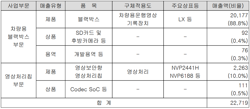 당사의 사업부문은 자동차 전장 사업부문으로 세부적으로는 차량용 블랙박스 부문, 영상처리 칩 부문 그리고 종속회사인 넥스트칩이 주력으로 하는 차량용 영상처리 칩 부문으로 구성되어 있습니다.
