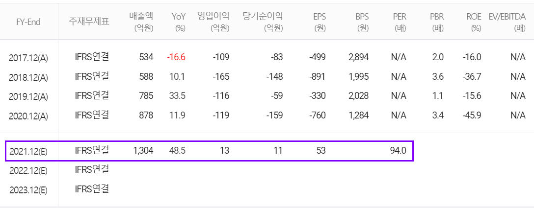 당사의 2021년 연간 예상실적은 매출액 1,304억 원으로 전년 대비 48.5% 증가하고, 영업이익은 13억 원으로 흑자 전환할 것으로 추정했습니다. 중국산 블랙박스 등 저가 제품 공세에 어려움을 겪으면서 사업 다각화를 위한 자율주행 솔루션인 VADAS 분야의 연구 개발에 따른 비용 부담으로 오랜 기간 적자를 지속하였으나, 올해 차량용 영상 처리 등에서 매출이 가시화되면서 흑자 전환 및 매출 확대를 예상하고 있습니다.