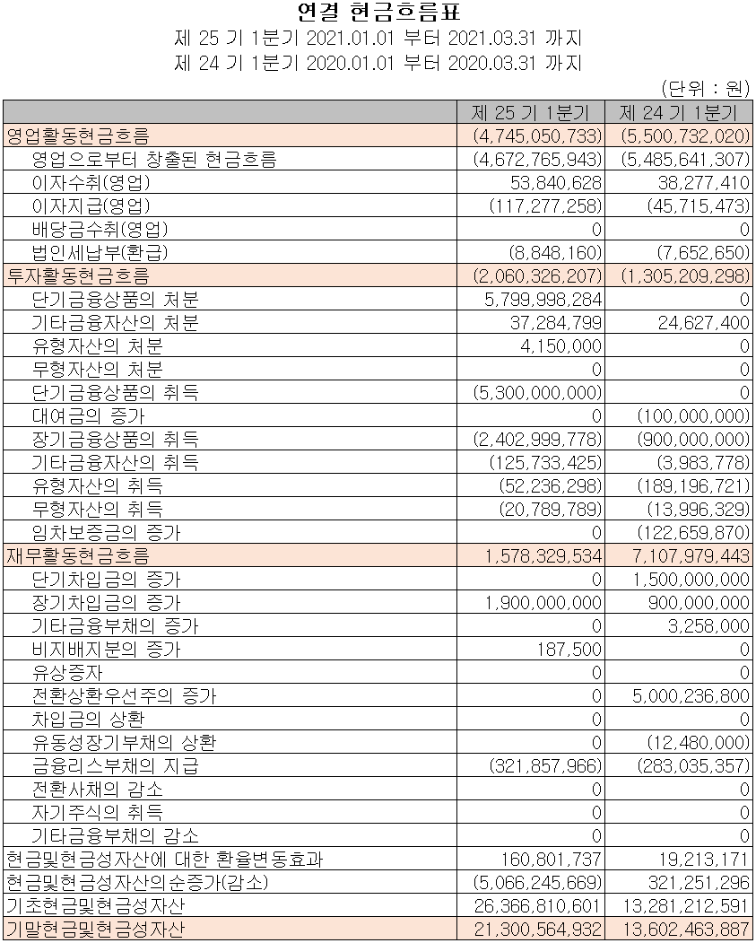 지난 1분기 영업활동 현금흐름에서는 총 47억 원의 현금이 유출되었으며, 차입금을 조달하여 부채를 상환하고 금융상품의 취득 및 유무형 자산을 취득했습니다. 2021년 1분기 말 기준 현금 및 현금성 자산은 213억 원을 보유하고 있습니다.