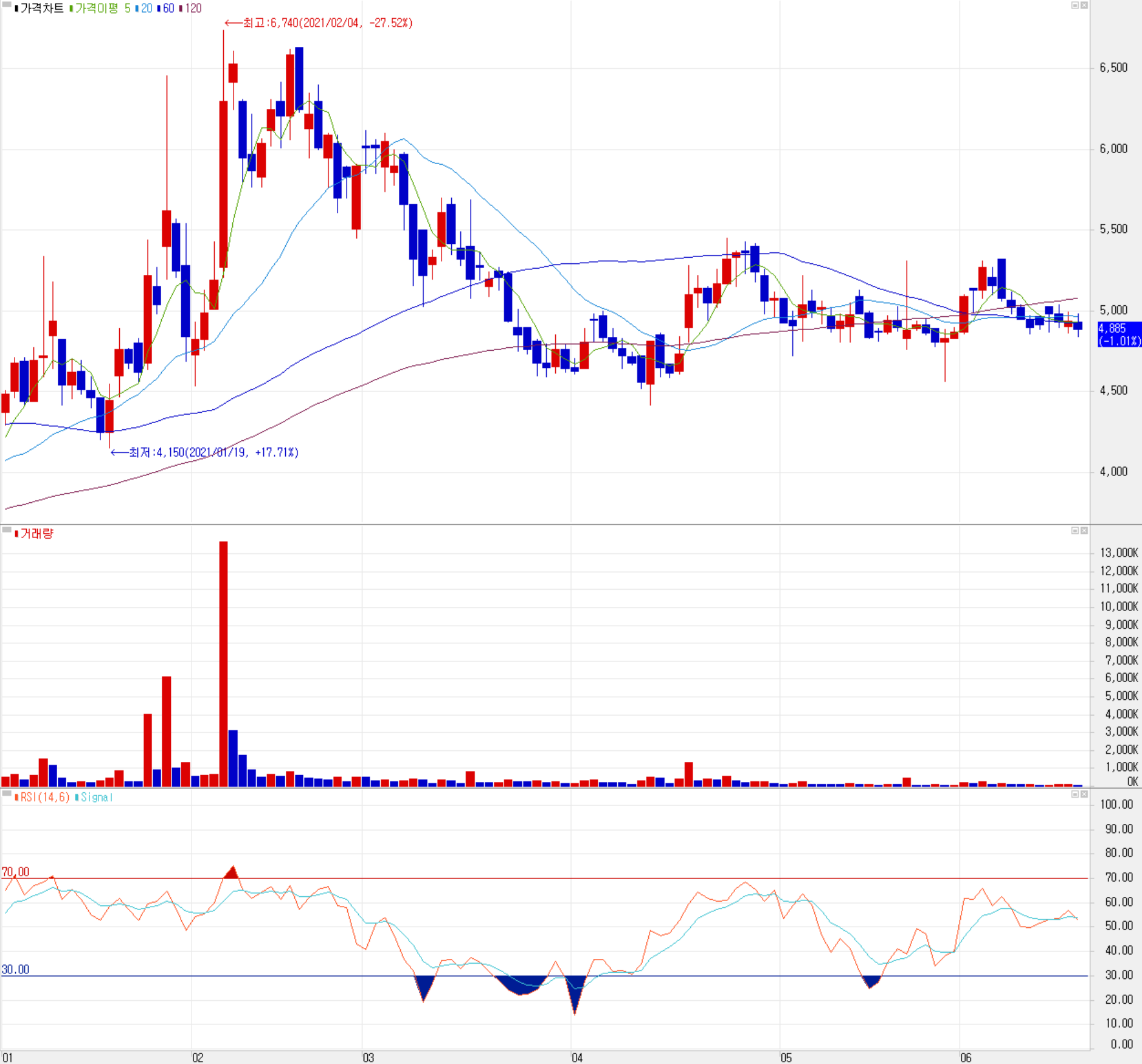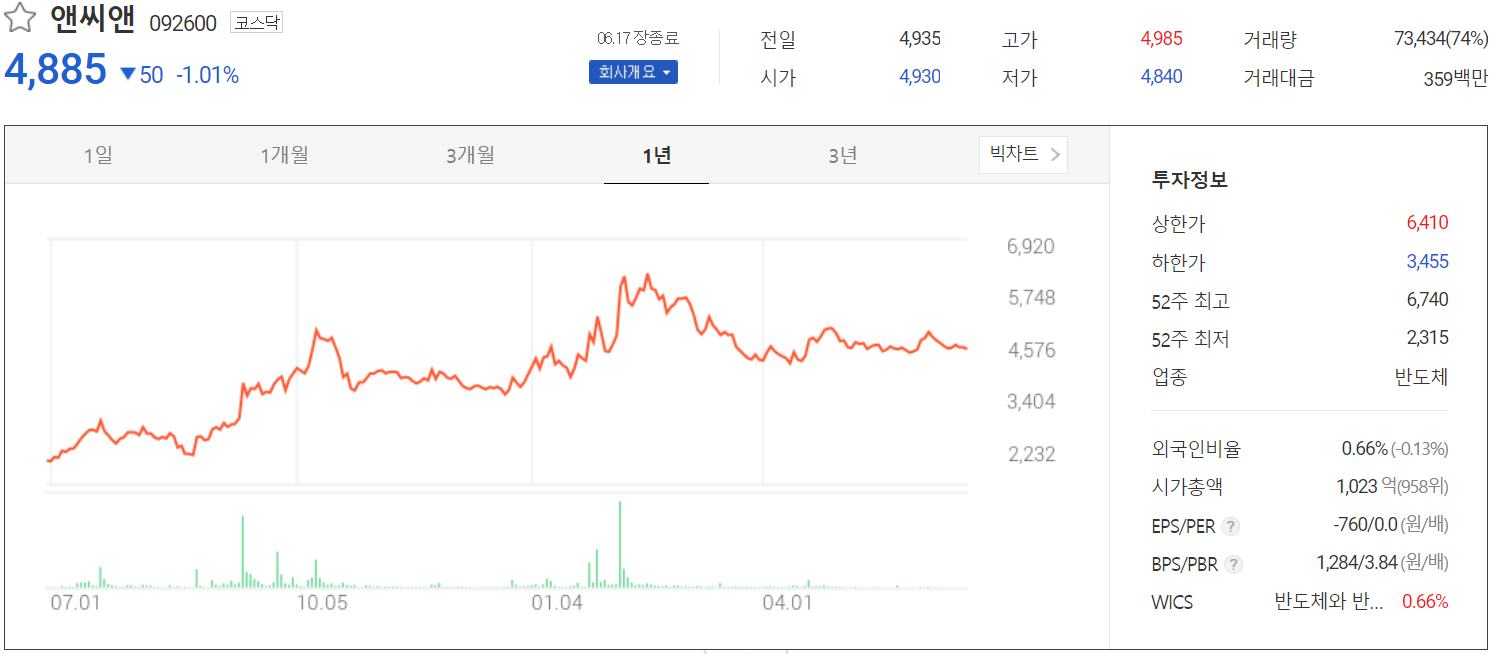 6월 17일 장 종료 기준 당사의 주가는 전일보다 1.01% 내린 4,885원에 거래를 마쳤습니다. 외국인 비중은 0.66%이며, 시가 총액 1,023억 원으로 코스닥 시총 기준 958위 종목입니다.