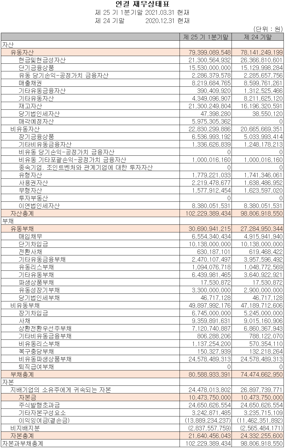 지난 1분기 자산 총계는 전기보다 3.5%(34억 원) 증가한 1,022억 원으로 토지, 건물 등 매각 예정 자산(59억 원)과 금융상품의 증가에 기인합니다. 부채 총계는 8.2%(61억 원) 증가한 806억 원으로 매입 채무 및 장기차입금의 증가가 있었습니다.
