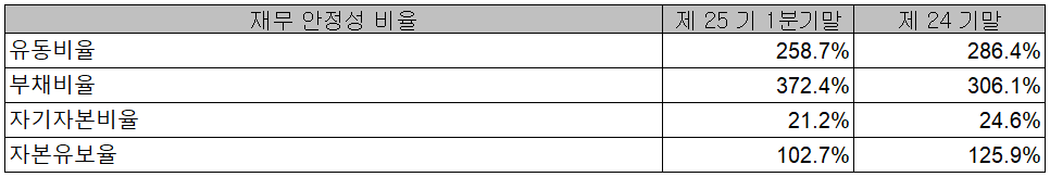 2021년 1분기 당사의 재무 안정성 비율에서는 유동비율 258.7%, 부채비율 372.4%, 자기 자본비율 21.2%, 자본 유보율 102.7%를 기록하였습니다. 자율주행 솔루션의 연구 개발 비용 및 기존 사업의 부진 등으로 적자가 지속되면서 부채도 증가하고 있으나 2021년 신규사업의 매출 가시화에 따른 흑자 전환을 계기로 점차 개선될 것으로 예상합니다.