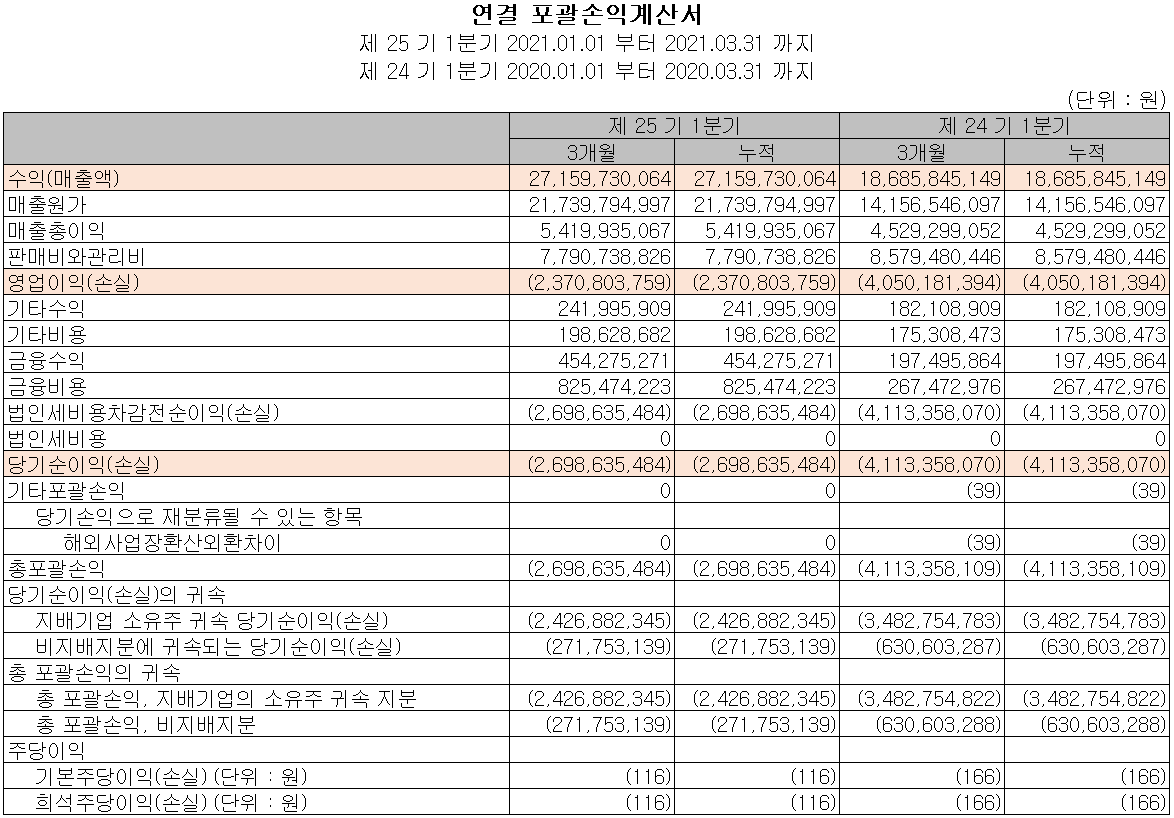 지난 1분기 당사의 실적은 매출액 272억 원으로 전년 동기 대비 45.3% 증가했고, 영업손실 24억 원, 당기순손실 27억 원으로 적자 지속입니다.