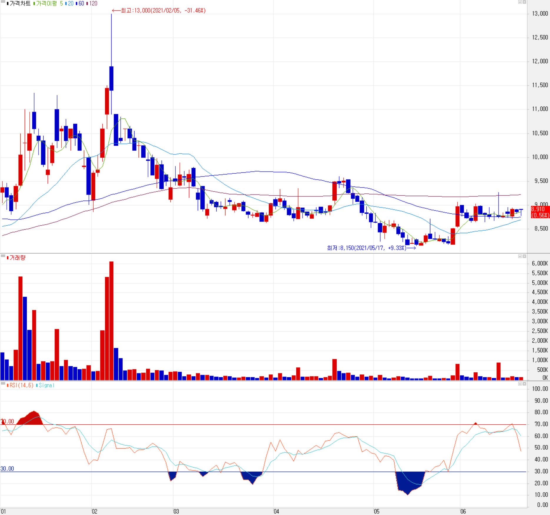 올해 초반 현대/기아차-애플 카 협력 소식에 급등하던 당사의 주가는 2월 들어서면서 신고가인 13,000원을 기록했으나, 애플 카 테마가 소멸되면서 상승분을 되돌렸고, 차량용 반도체 부족으로 인한 생산 차질까지 겹치면서 지난 5월에는 연중 최저가인 8,150원까지 하락했다가 최근에는 8,500~9,000원 사이에서 주가가 형성되고 있습니다. 수급에서는 최근 7 거래일 연속 순매수 중인 개인의 매수 우위 가운데 기관은 매도로 대응하고 있습니다. 차량용 반도체 부족 사태로 인한 가동 중단 문제는 서서히 풀리면서 수급이 해소될 것으로 보면서 전반적인 자동차 전장 및 부품 업계 실적이 회복될 것으로 예상됩니다. 차트 소견 상 개인적인 목표주가는 지난 분석과 같은 10,500원으로 유지합니다.