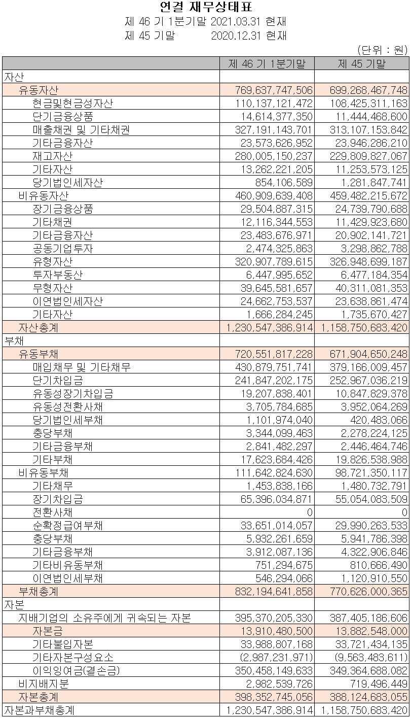 지난 1분기 자산 총계는 전기보다 6.2%(718억 원) 증가한 1조 2,305억 원으로 매출채권 및 재고자산의 증가에 기인합니다. 부채는 8%(616억 원) 증가한 8,322억 원으로 매입채무 및 장기차입금의 증가가 있었습니다.