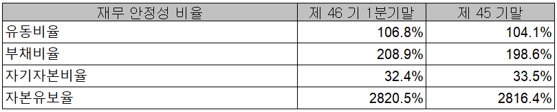 2021년 1분기 말 기준 재무 안정성 비율에서는 유동비율 106.8%, 부채비율 208.9%, 자기 자본비율 32.4%, 자본 유보율 2,820.5%를 기록하였습니다. 신규사업으로 인한 부채 부담이 증가하고 있으나 지난 2020년 4분기부터 흑자 전환하면서 점차 부채비율도 개선될 것으로 예상합니다.