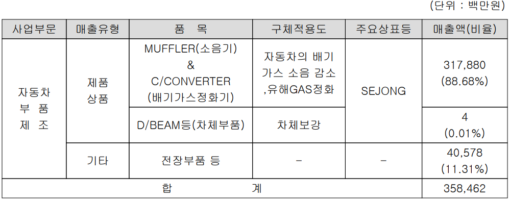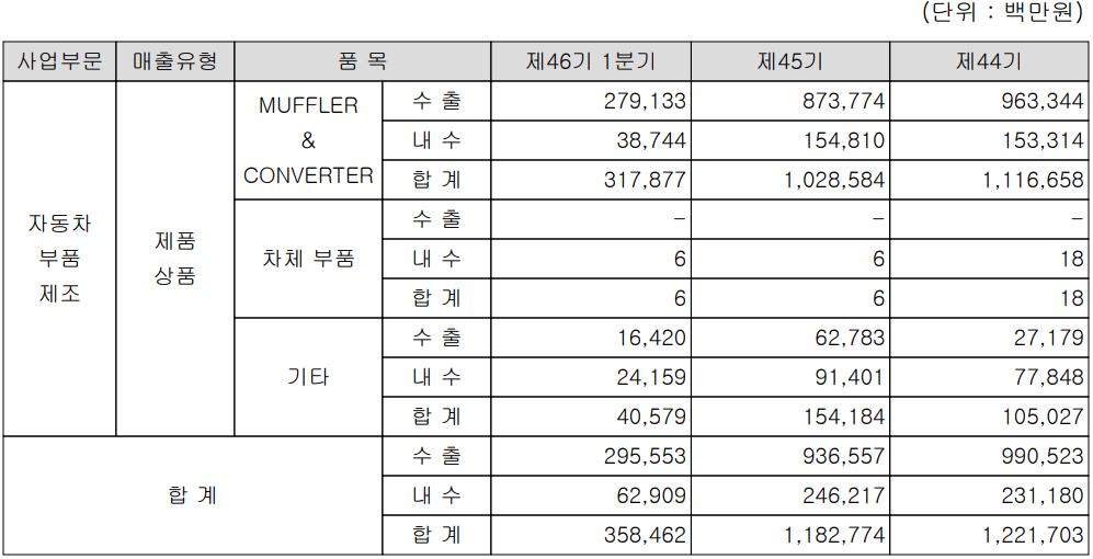 당사는 자동차 부품을 제조, 공급하는 단일 사업부문으로 주력 제품인 소음기, 정화기 등 배기가스 시스템 관련 제품과 차체 부품 그리고 신성장 동력으로 수소 센서를 비롯한 자동차 전장 부품 등을 생산하고 있습니다. 지난 1분기 자동차 배기가스 관련 매출액은 3,179억 원으로 전체 매출의 88.68%를 차지하였으며, 자동차 전장 부품은 406억 원의 매출로 11.31%의 매출 비중을 기록했습니다.