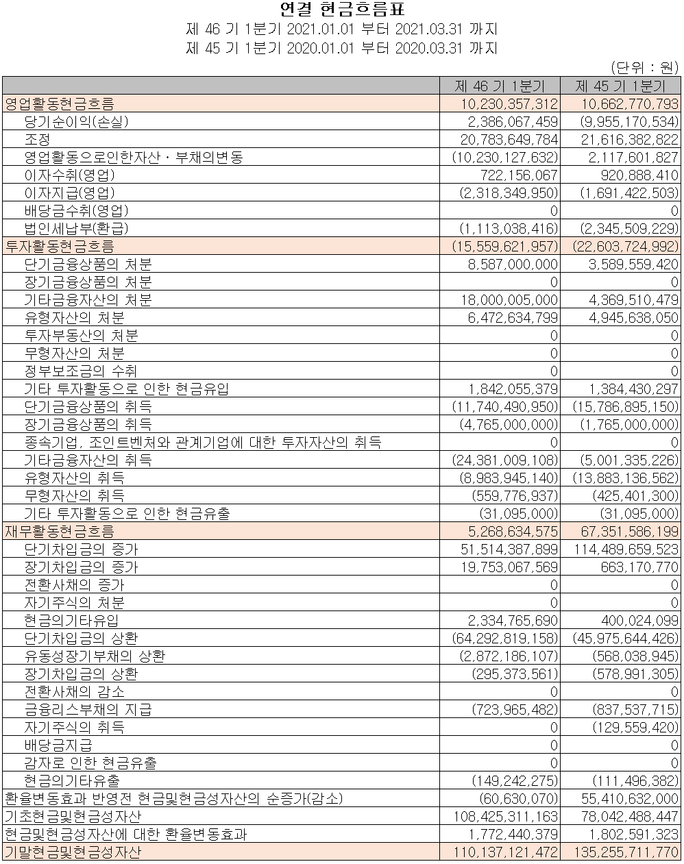 지난 1분기 영업활동 현금흐름에서는 총 102억 원의 현금이 유입되었으며, 장단기 차입금을 조달하여 부채를 상환하고 금융상품의 취득 및 유무형 자산의 취득이 있었습니다. 2021년 1분기 말 기준 현금 및 현금성 자산은 전년 동기 대비 18.6% 줄어든 1,101억 원을 보유하고 있습니다.