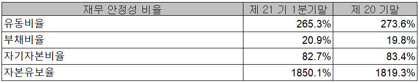 2021년 1분기 재무 안정성 비율에서는 유동비율 265.3%, 부채비율 20.9%, 자기자본비율 82.7%, 자본 유보율 1,850.1%를 기록하면서 안정적인 재무상태를 유지하고 있습니다.