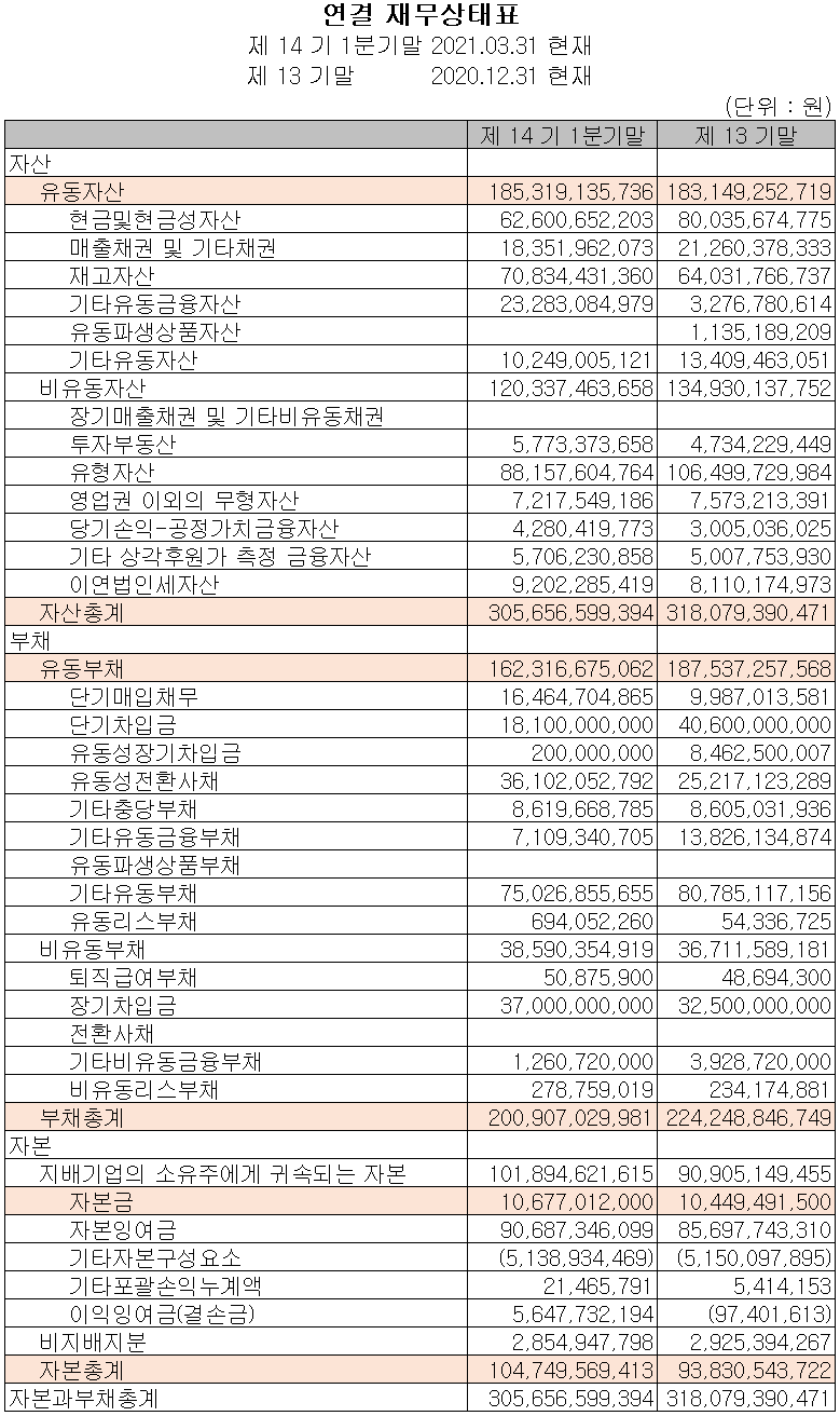 지난 1분기 자산 총계는 전기보다 3.9%(124억 원) 감소한 3,057억 원으로 현금성 자산 및 유형 자산의 처분(210억 원 규모의 토지 및 건물)에 따른 감소가 있었습니다. 부채 총계는 전기보다 10.4%(233억 원) 감소한 2,009억 원으로 단기차입금의 감소에 기인합니다.