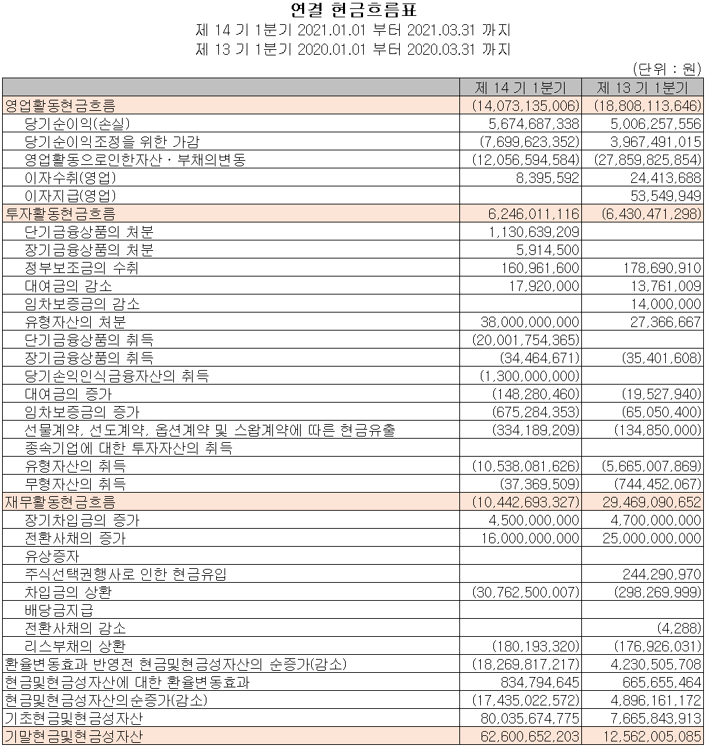 지난 1분기 당사의 영업활동 현금흐름은 총 141억 원의 현금이 유출되었으며, 차입금 및 사채를 발행하여 자금을 조달하였고 부채를 상환하고 유무형 자산을 취득하였습니다. 2021년 1분기 말 기준 현금 및 현금성 자산은 전년 동기 대비 500억 원 증가한 626억 원을 보유하고 있습니다.