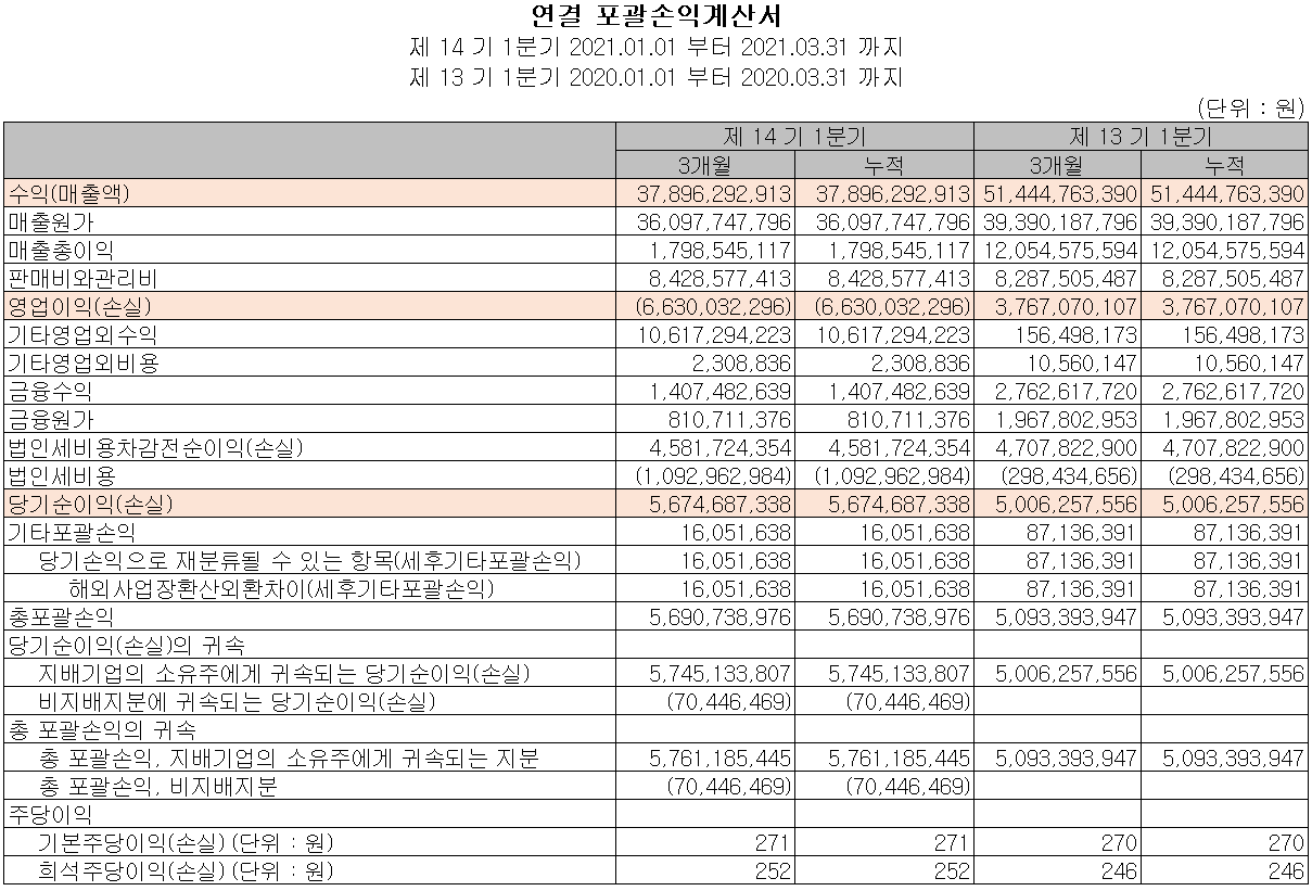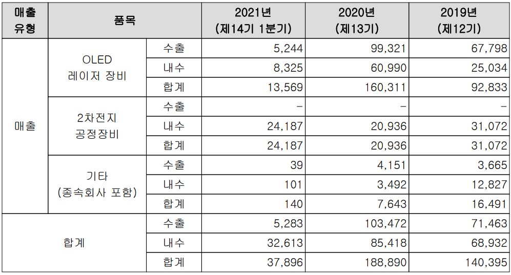 2021년 1분기 당사의 실적은 매출액 379억 원으로 전년 동기 대비 26.3% 감소했고, 영업손실 66억 원으로 적자 전환, 당기순이익은 57억 원으로 13.4% 증가했습니다. 1분기 OLED 레이저 장비의 공급이 감소하면서 전반적인 실적 부진을 겪었습니다.