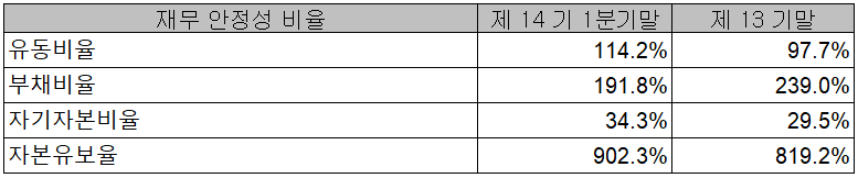 당사의 2021년 1분기 재무 안정성 비율에서는 유동비율 114.2%, 부채비율 191.8%, 자기자본비율 34.3%, 자본 유보율 902.3%를 기록하였습니다. 최근 코로나19의 어려운 경영환경에서도 반도체 노광장비의 개발에 투자하면서 부채 비율이 높은 상태지만 고객사 데모 장비의 수주가 발생하면서 향후 노광장비의 상품화가 이루어질 것으로 기대합니다. 또한 코로나19로 지연된 디스플레이 및 2차전지 장비의 수주도 점차 회복될 것으로 전망하고 있습니다.