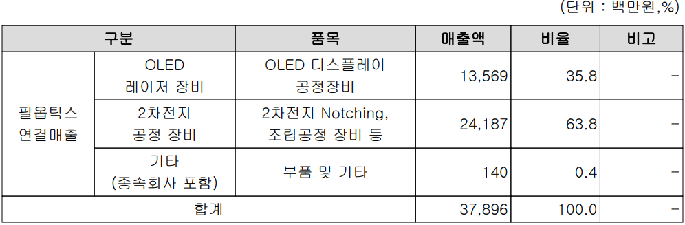 당사는 독보적인 광학기술 기반으로 OLED 레이저 가공 장비 및 2차전지 조립 공정 장비 등을 제조, 공급하고 있습니다. 지난 1분기 OLED 장비의 매출액은 136억 원으로 전체 매출의 35.8%를 차지하였으며, 2차전지 공정 장비는 242억 원으로 63.8%의 매출 비중을 나타냈습니다.