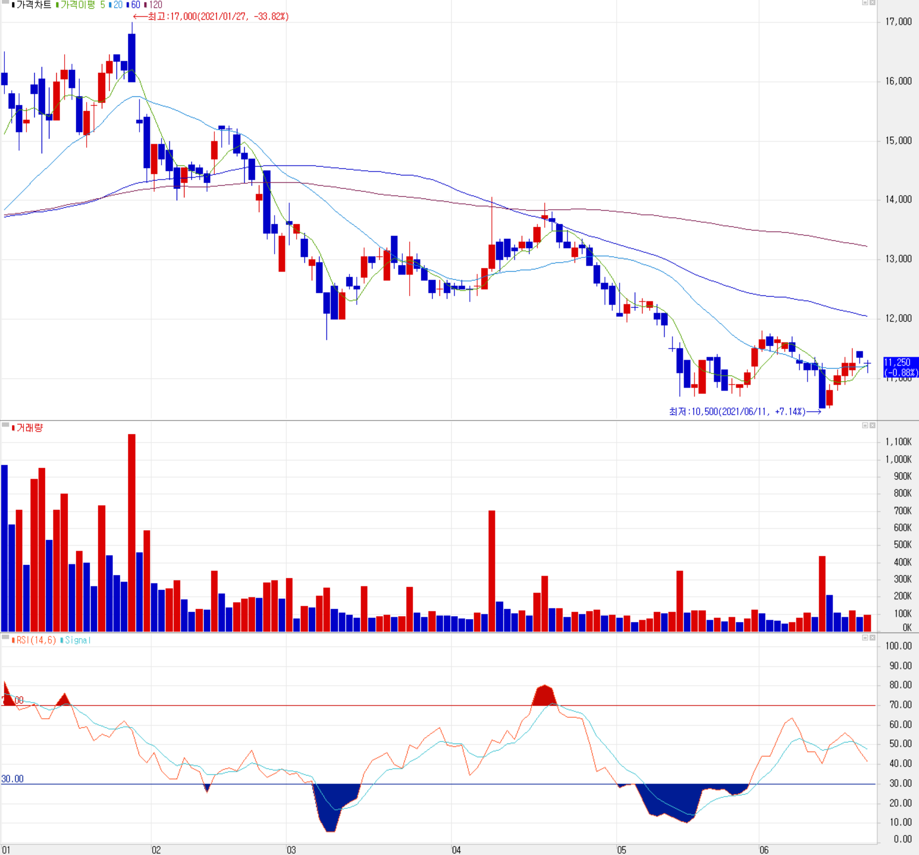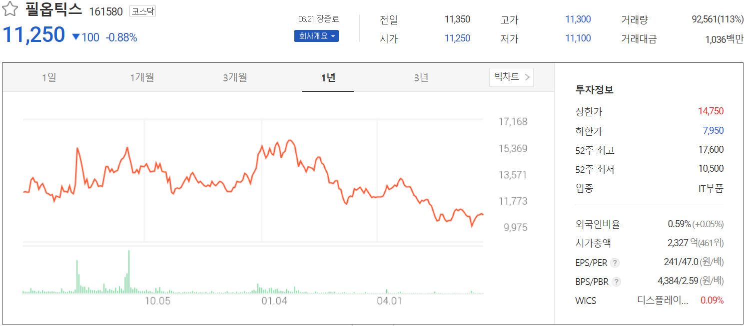 6월 21일 장 종료 기준 당사의 주가는 전 거래일 대비 0.88% 내린 11,250원에 거래를 마쳤습니다. 외국인 비중은 0.59%이며, 시가 총액 2,327억 원으로 코스닥 시총 기준 461위 종목입니다.