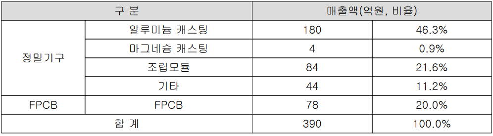당사는 다이캐스팅 기술 기반의 스마트폰 및 IT, 소형 전자제품의 기구물을 제조, 공급하고 있는 정밀기구 사업부문과 연성회로기판(FPCB) 사업부문으로 구성되어 있습니다. 지난 1분기 정밀기구 사업부문에서 알루미늄 캐스팅 제품의 매출은 180억 원으로 전체 매출의 46.3%를 차지하였고, 폴더블 힌지 등 조립모듈의 경우 84억 원의 매출로 21.6%의 매출 비중을, FPCB 사업부문은 78억 원의 매출로 20%의 매출 비중을 기록했습니다.