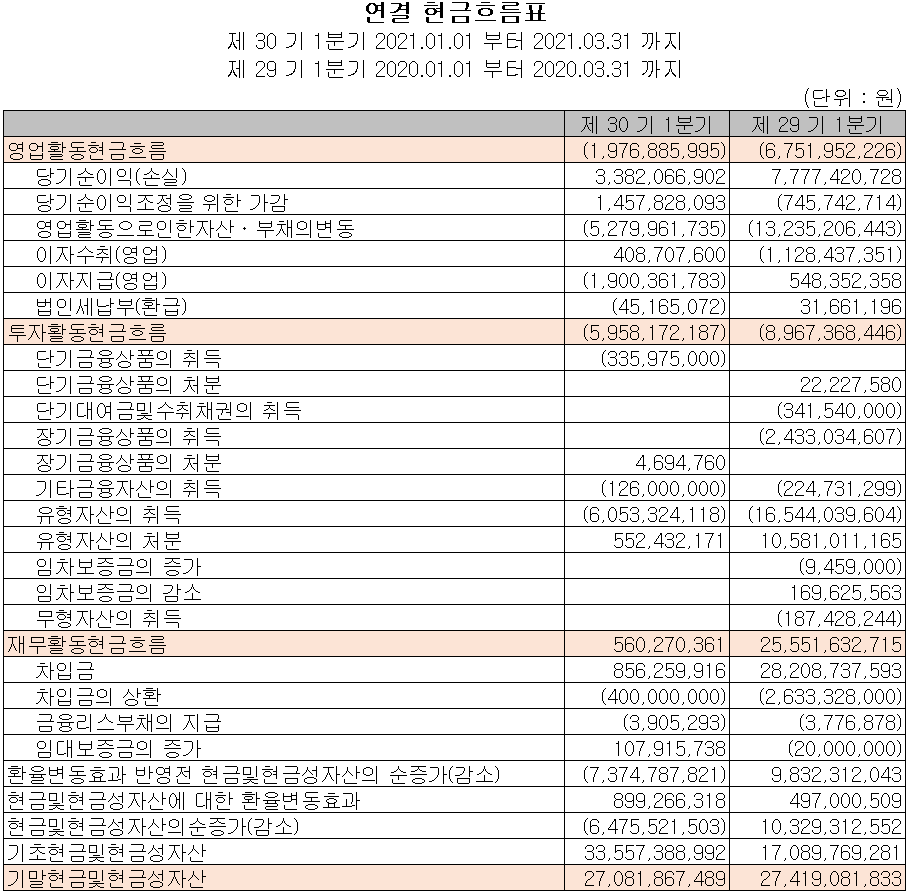 당사의 지난 1분기 영업활동 현금흐름에서는 매출채권 및 미수금의 증가 등으로 운전 자산의 변동이 발생하면서 총 20억 원의 현금이 유출되었습니다. 차입금을 조달하여 부채를 상환하고 유형 자산을 취득하였습니다. 2021년 1분기 말 기준 현금 및 현금성 자산은 전년 동기보다 3억 원 감소한 270억 원을 보유하고 있습니다.