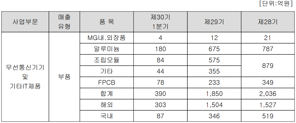 당사는 다이캐스팅 기술 기반의 스마트폰 및 IT, 소형 전자제품의 기구물을 제조, 공급하고 있는 정밀기구 사업부문과 연성회로기판(FPCB) 사업부문으로 구성되어 있습니다. 지난 1분기 정밀기구 사업부문에서 알루미늄 캐스팅 제품의 매출은 180억 원으로 전체 매출의 46.3%를 차지하였고, 폴더블 힌지 등 조립모듈의 경우 84억 원의 매출로 21.6%의 매출 비중을, FPCB 사업부문은 78억 원의 매출로 20%의 매출 비중을 기록했습니다.