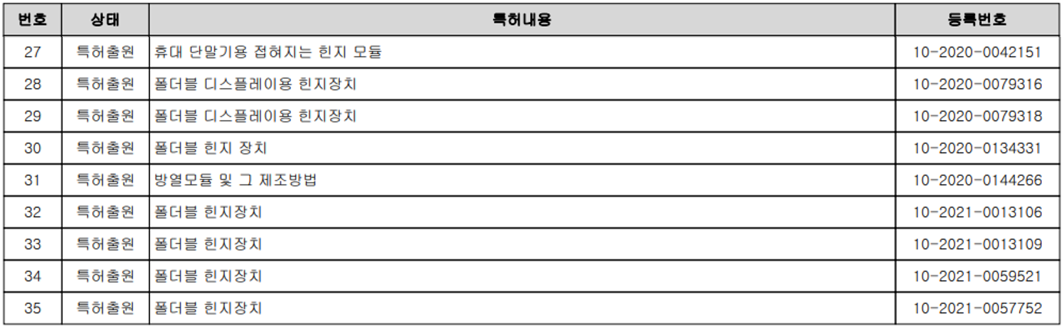 지난해부터 올해까지 다수의 폴더블 스마트폰 힌지 장치에 대한 특허를 출원하면서 경쟁력 및 진입장벽을 키워가고 있습니다.
