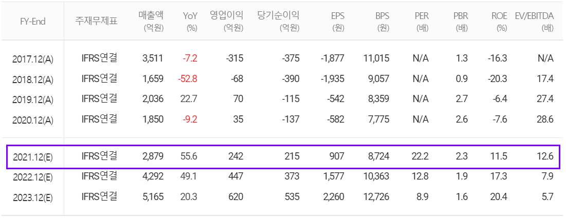 당사의 2021년 연간 예상실적은 매출액 2,879억 원으로 전년 대비 55.6% 증가하고, 영업이익은 242억 원으로 591% 증가, 당기순이익은 215억 원으로 흑자 전환할 것으로 추정했습니다. 하반기부터는 폴더블 폰용 힌지의 본격 양산에 따른 매출 확대가 예상되면서 전반적인 실적을 견인할 것으로 내다봤습니다.