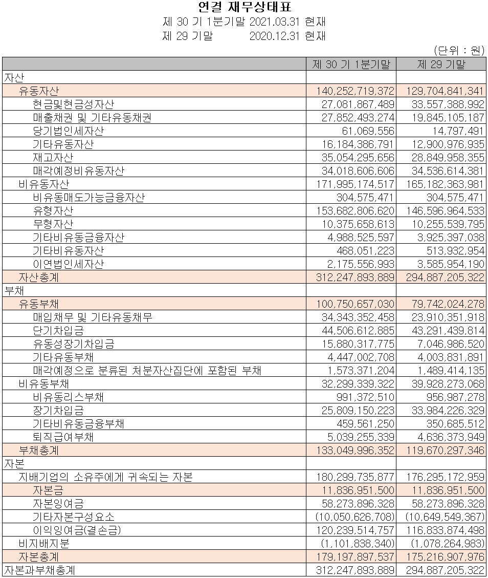 당사의 지난 1분기 영업활동 현금흐름에서는 매출채권 및 미수금의 증가 등으로 운전 자산의 변동이 발생하면서 총 20억 원의 현금이 유출되었습니다. 차입금을 조달하여 부채를 상환하고 유형 자산을 취득하였습니다. 2021년 1분기 말 기준 현금 및 현금성 자산은 전년 동기보다 3억 원 감소한 270억 원을 보유하고 있습니다.