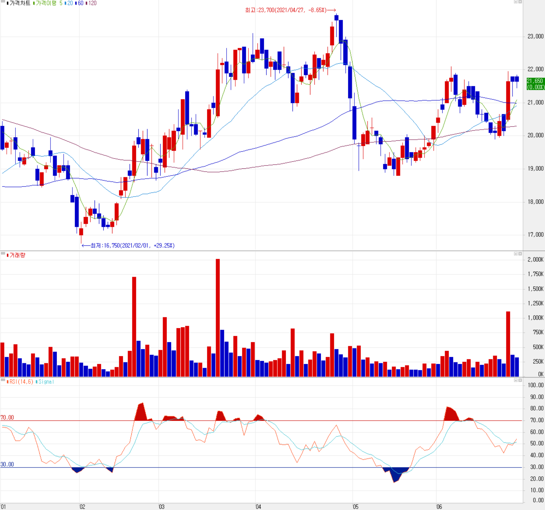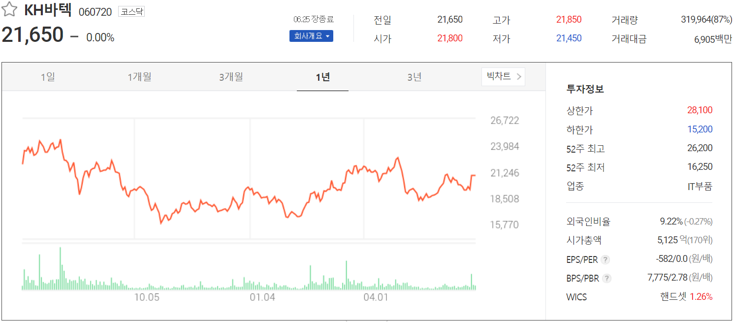 6월 25일 장 종료 기준 당사의 주가는 21,650원에 거래를 마쳤습니다. 외국인 비중은 9.22%이며, 시가 총액 5,125억 원으로 코스닥 시총 기준 170위 종목입니다.
