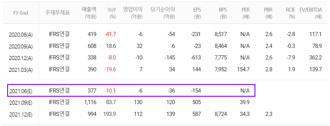 2021년 2분기 예상 실적은 매출액 377억 원으로 전년 대비 10.1% 감소하고, 영업손실 6억 원, 당기순손실 36억 원을 기록할 것으로 추정했습니다. 지난 1분기 저조한 실적에 이어 2분기에도 실적 하락이 예상되는 주요 요인은 주력 제품인 폴더블 폰의 출시가 없기 때문에 새로운 수요 창출의 감소로 인한 것입니다.