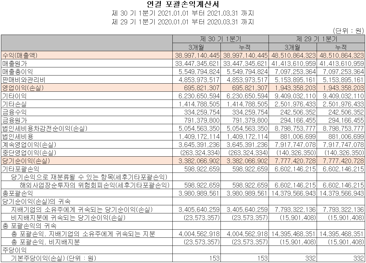 당사의 지난 1분기 실적은 매출액 390억 원으로 전년 동기 대비 19.6% 감소했고, 영업이익은 7억 원으로 64.2% 감소, 당기순이익은 34억 원으로 56.5% 감소했습니다.